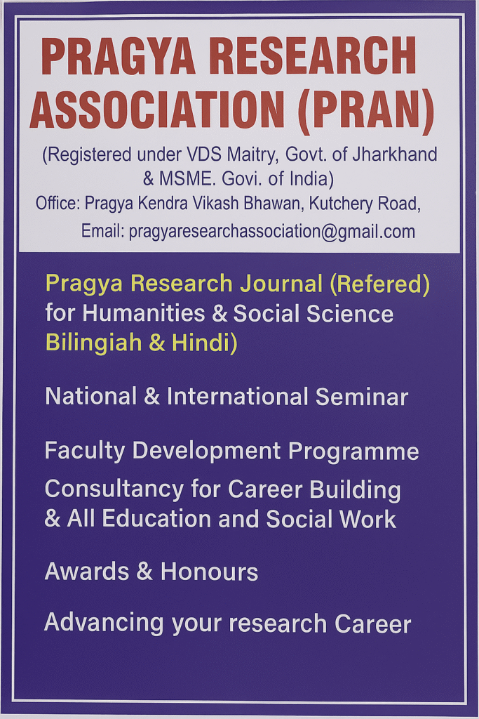Pragya Research Association (PRAN) is a registered organization under VDS Maitry, Government of Jharkhand, and MSME, Government of India. Based in Ranchi, PRAN is committed to promoting excellence in the fields of Humanities and Social Sciences through its bilingual (English & Hindi) research journal and a wide range of academic and social development programs.